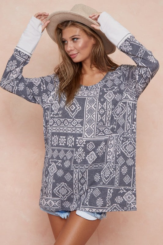 This beautiful Aztec print in gray and white features thumb openings in the cuffs.