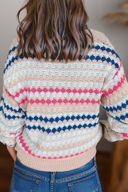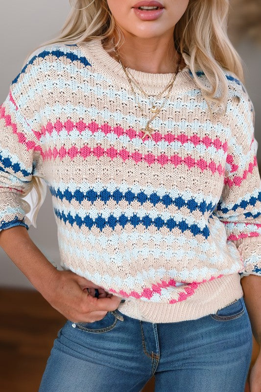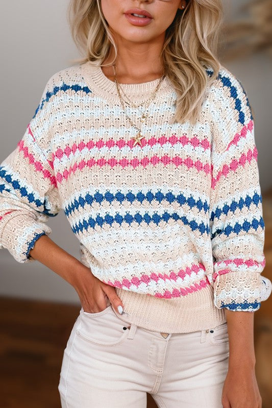 This gorgeous, loose fit sweater features a drop shoulder design for a relaxed fit. The eyelet pattern adds a touch of elegance. Comfortable and cozy fabric for all-day wear.